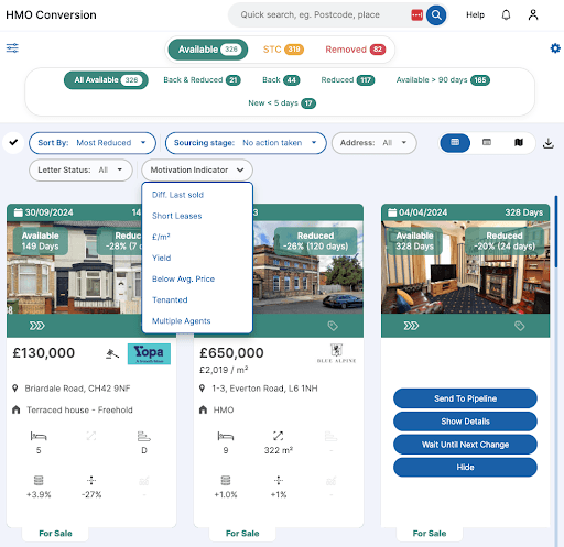 Both platforms offer motivated seller identification, but with different approaches. Property Filter is specifically designed for motivated seller deals with 90+ specialized filters for HMO opportunities, BRRR potential, properties with extended time on market, price reduction history, and areas with high motivated seller concentrations. Property Engine also provides motivated seller criteria including price reductions, back on market properties, AI property condition analysis, probate properties, low EPC ratings, repossessed properties, and planning application data.