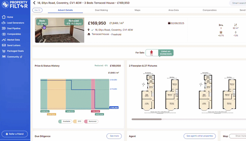 On Rightmove, you see only today's listing - the current price, the current description. Property Filter shows the full history: how long the property has actually been on the market, every price change, whether it went under offer and fell through, and whether it was withdrawn and relisted. That history is what reveals seller motivation - and it is not available on any standard portal.
